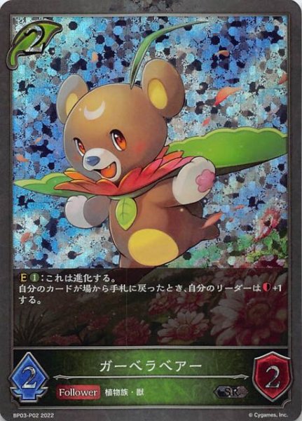 ガーベラベアー クラス エルフ カード種類 フォロワー タイプ 植物族・獣 レアリティ SR・プレミアム 収録商品 ブースターパック第3弾「FLAME OF LAEVATEINN / フレイム・オブ・レーヴァテイン」 コスト2攻撃力2体力2 :これは進化する。自分のカードが場から手札に戻ったとき、自分のリーダーは+1する。 anchobiBP03-P02