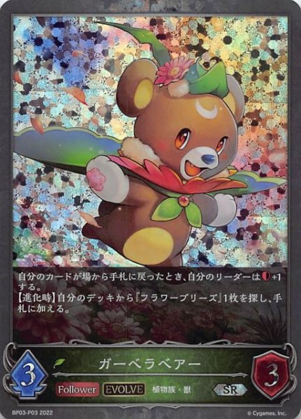 ガーベラベアー クラス エルフ カード種類 フォロワー・エボルヴ タイプ 植物族・獣 レアリティ SR・プレミアム 収録商品 ブースターパック第3弾「FLAME OF LAEVATEINN / フレイム・オブ・レーヴァテイン」 コスト-攻撃力3体力3 自分のカードが場から手札に戻ったとき、自分のリーダーは+1する。【進化時】自分のデッキから『フラワーブリーズ』1枚を探し、手札に加える。 anchobiBP03-P03