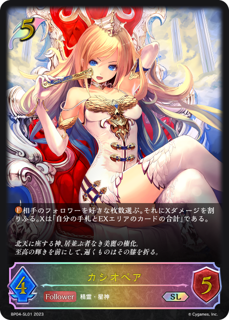 カシオペア クラス エルフ カード種類 フォロワー タイプ 精霊・星神 レアリティ SL 収録商品 ブースターパック第4弾「天星神話」 コスト5攻撃力4体力5 相手のフォロワーを好きな枚数選ぶ。それにXダメージを割りふる。Xは「自分の手札とEXエリアのカードの合計」である。 北天に座する神、居並ぶ者なき美麗の権化。至高の輝きを前にして、遍くものはその膝を折る。 虫麻呂BP04-SL01