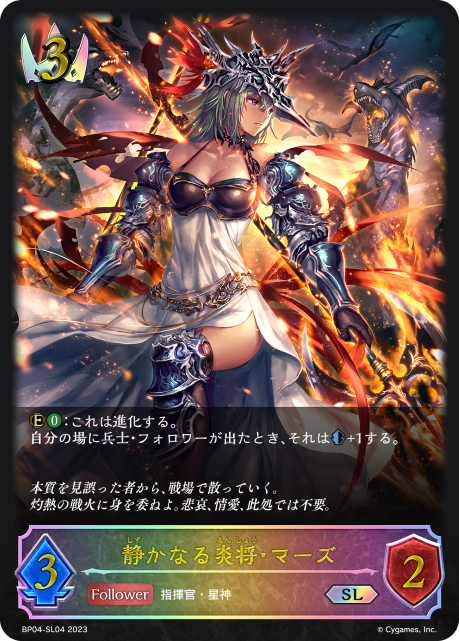 静かなる炎将・マーズ クラス ロイヤル カード種類 フォロワー・エボルヴ タイプ 指揮官・星神 レアリティ SL 収録商品 ブースターパック第4弾「天星神話」 コスト-攻撃力4体力3 自分の場に兵士・フォロワーが出たとき、それは+1する。【進化時】《コストX》:自分のデッキから「コストX以下の兵士・フォロワー」1枚を探し、場に出す。 iruaBP04-SL05