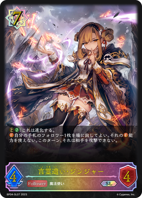 言霊遣い・ジンジャー クラス ウィッチ カード種類 フォロワー タイプ 魔法使い レアリティ SL 収録商品 ブースターパック第4弾「天星神話」 コスト7攻撃力4体力4 :これは進化する。自分の手札のフォロワー1枚を場に出してよい。それの能力を使えない。このターン、それは相手を攻撃できない。 ヘスンBP04-SL07