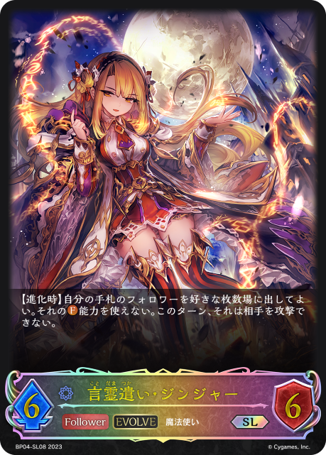 言霊遣い・ジンジャー クラス ウィッチ カード種類 フォロワー・エボルヴ タイプ 魔法使い レアリティ SL 収録商品 ブースターパック第4弾「天星神話」 コスト-攻撃力6体力6 【進化時】自分の手札のフォロワーを好きな枚数場に出してよい。それの能力を使えない。このターン、それは相手を攻撃できない。 ヘスンBP04-SL08