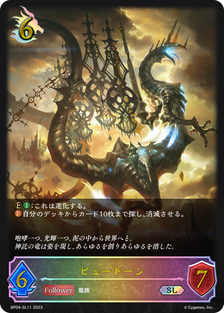 ピュートーン クラス ドラゴン カード種類 フォロワー タイプ 竜族 レアリティ SL 収録商品 ブースターパック第4弾「天星神話」 コスト6攻撃力6体力7 :これは進化する。自分のデッキからカード10枚まで探し、消滅させる。 咆哮一つ、光輝一つ、泥の中から世界へと。神託の竜は姿を現し、あらゆるを創りあらゆるを消した。 宮﨑章BP04-SL11