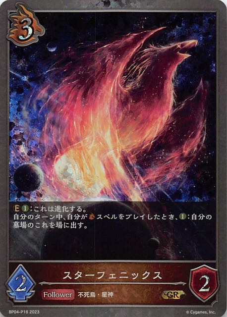 スターフェニックス クラス ドラゴン カード種類 フォロワー タイプ 不死鳥・星神 レアリティ GR・プレミアム 収録商品 ブースターパック第4弾「天星神話」 コスト3攻撃力2体力2 :これは進化する。自分のターン中、自分がスペルをプレイしたとき、:自分の墓場のこれを場に出す。 BP04-P16