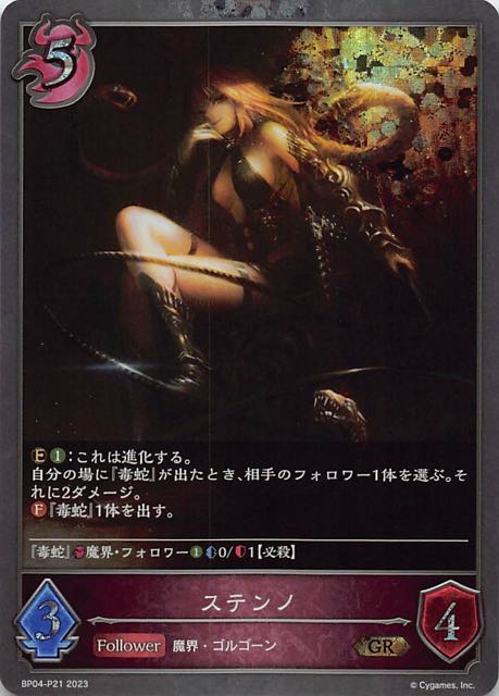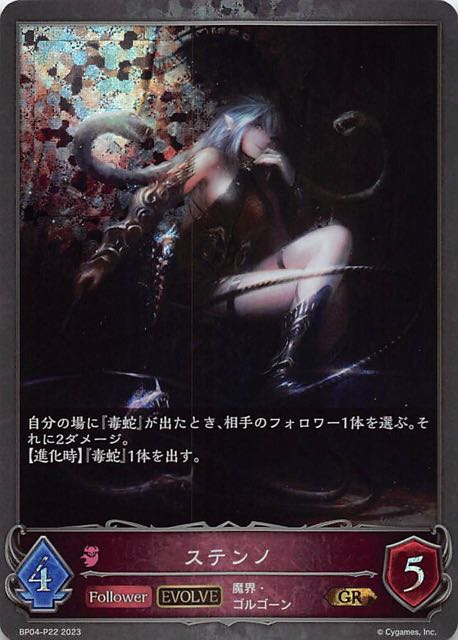 ステンノ クラス ナイトメア カード種類 フォロワー タイプ 魔界・ゴルゴーン レアリティ GR・プレミアム 収録商品 ブースターパック第4弾「天星神話」 コスト5攻撃力3体力4 :これは進化する。自分の場に『毒蛇』が出たとき、相手のフォロワー1体を選ぶ。それに2ダメージ。『毒蛇』1体を出す。―――――――――――――――『毒蛇』魔界・フォロワー0/1【必殺】 宮﨑章BP04-P21