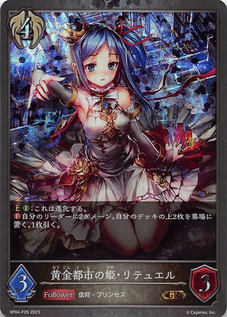 黄金都市の姫・リテュエル クラス ビショップ カード種類 フォロワー タイプ 信仰・プリンセス レアリティ GR・プレミアム 収録商品 ブースターパック第4弾「天星神話」 コスト4攻撃力3体力3 :これは進化する。自分のリーダーに2ダメージ。自分のデッキの上2枚を墓場に置く。1枚引く。 LM7BP04-P26