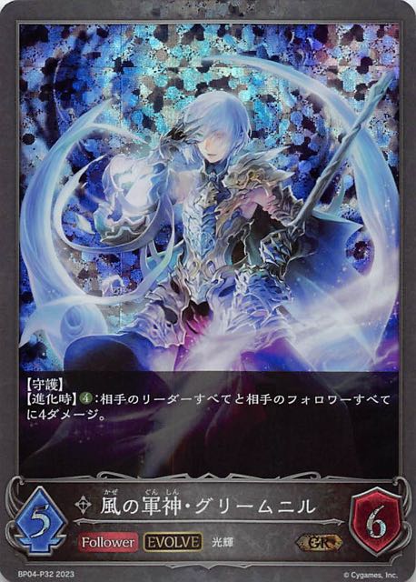 風の軍神・グリームニル クラス ニュートラル カード種類 フォロワー・エボルヴ タイプ 光輝 レアリティ GR・プレミアム 収録商品 ブースターパック第4弾「天星神話」 コスト-攻撃力5体力6 【守護】【進化時】:相手のリーダーすべてと相手のフォロワーすべてに4ダメージ。 BP04-P32