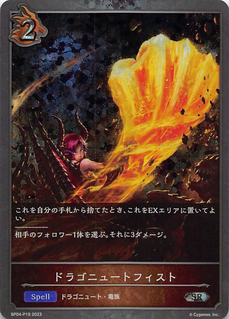 ドラゴニュートフィスト クラス ドラゴン カード種類 スペル タイプ ドラゴニュート・竜族 レアリティ SR・プレミアム 収録商品 ブースターパック第4弾「天星神話」 コスト2攻撃力-体力- これを自分の手札から捨てたとき、これをEXエリアに置いてよい。----------相手のフォロワー1体を選ぶ。それに3ダメージ。 BudiBP04-P19