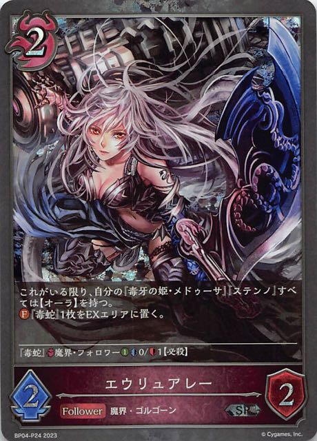 エウリュアレー クラス ナイトメア カード種類 フォロワー タイプ 魔界・ゴルゴーン レアリティ SR・プレミアム 収録商品 ブースターパック第4弾「天星神話」 コスト2攻撃力2体力2 これがいる限り、自分の『毒牙の姫・メドゥーサ』『ステンノ』すべては【オーラ】を持つ。『毒蛇』1枚をEXエリアに置く。―――――――――――――――『毒蛇』魔界・フォロワー0/1【必殺】 ニジハヤシBP04-P24