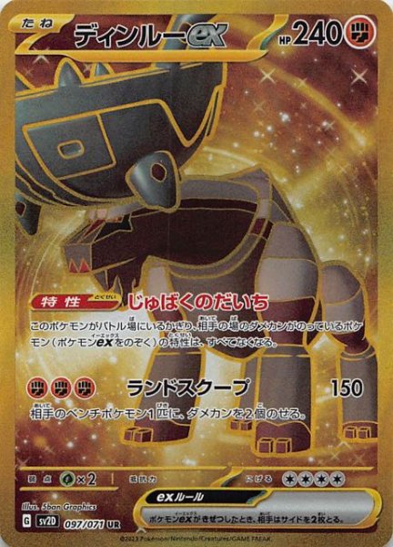 たね HP 240 タイプ 特性 じゅばくのだいち このポケモンがバトル場にいるかぎり、相手の場のダメカンがのっているポケモン(ポケモンexをのぞく)の特性は、すべてなくなる。 ワザ ランドスクープ150 相手のベンチポケモン1匹に、ダメカンを2個のせる。 特別なルール ポケモンexがきぜつしたとき、相手はサイドを2枚とる。