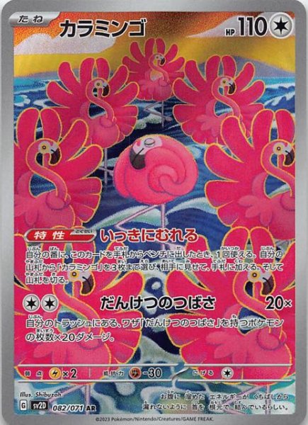 たね HP 110 タイプ 特性 いっきにむれる 自分の番に、このカードを手札からベンチに出したとき、1回使える。自分の山札から「カラミンゴ」を3枚まで選び、相手に見せて、手札に加える。そして山札を切る。 ワザ だんけつのつばさ20× 自分のトラッシュにある、ワザ「だんけつのつばさ」を持つポケモンの枚数×20ダメージ。