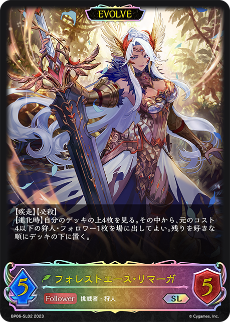 フォレストエース・リマーガ クラス エルフ カード種類 フォロワー タイプ 挑戦者・狩人 レアリティ SL 収録商品 ブースターパック第6弾「絶対なる覇者」 コスト6攻撃力4体力4 :これは進化する。【疾走】【必殺】自分のデッキの上4枚を見る。その中から、元のコスト4以下の狩人・フォロワー1枚を場に出してよい。残りを好きな順にデッキの下に置く。 BIYOBP06-SL01