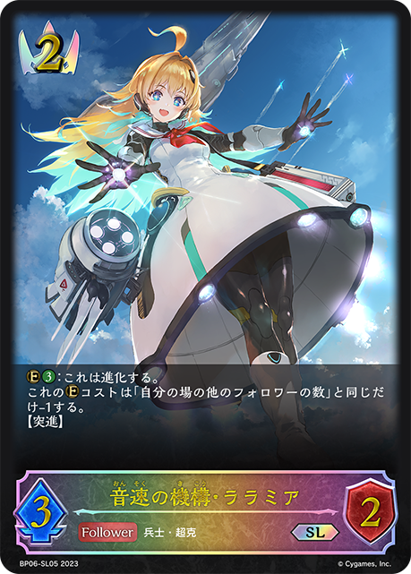 音速の機構・ララミア クラス ロイヤル カード種類 フォロワー タイプ 兵士・超克 レアリティ SL 収録商品 ブースターパック第6弾「絶対なる覇者」 コスト2攻撃力3体力2 :これは進化する。これのコストは「自分の場の他のフォロワーの数」と同じだけ-1する。【突進】 ぽんずBP06-SL05