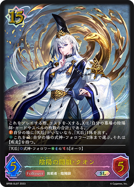 陰陽の開祖・クオン クラス ウィッチ カード種類 フォロワー タイプ 挑戦者・陰陽師 レアリティ SL 収録商品 ブースターパック第6弾「絶対なる覇者」 コスト15攻撃力5体力5 これをプレイする際、コストを-Xする。Xは「自分の墓場の陰陽師・カードやスペルの枚数の合計」である。自分の場に『天后』がいないなら、『天后』1体を出す。これを:自分の場の式神・フォロワー2体まで選ぶ。それは【疾走】を持つ。―――――――――――――――『天后』式神・フォロワー4/5【オーラ】 虹原BP06-SL07