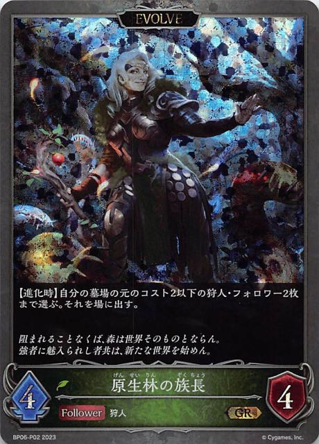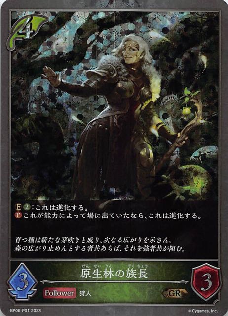 原生林の族長 クラス エルフ カード種類 フォロワー タイプ 狩人 レアリティ GR・プレミアム 収録商品 ブースターパック第6弾「絶対なる覇者」 コスト4攻撃力3体力3 :これは進化する。これが能力によって場に出ていたなら、これは進化する。 育つ種は新たな芽吹きと成り、次なる広がりを示さん。森の広がり止めんとする者共あらば、それを強者共が阻む。 南保あたるBP06-P01