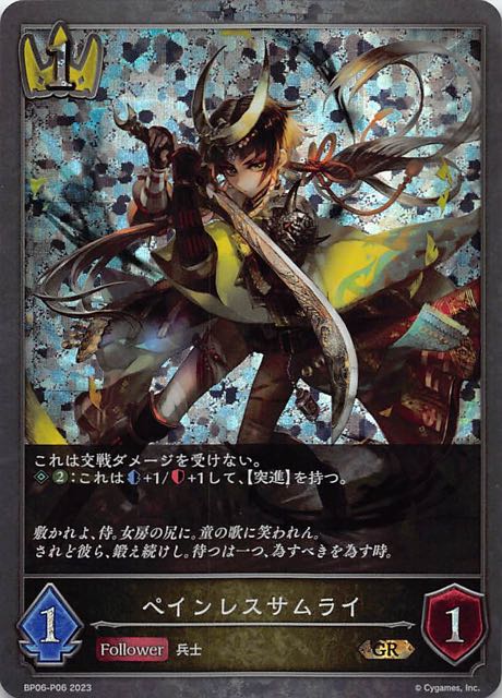 ペインレスサムライ クラス ロイヤル カード種類 フォロワー タイプ 兵士 レアリティ GR・プレミアム 収録商品 ブースターパック第6弾「絶対なる覇者」 コスト1攻撃力1体力1 これは交戦ダメージを受けない。:これは+1/+1して、【突進】を持つ。 敷かれよ、侍。女房の尻に。童の歌に笑われん。されど彼ら、鍛え続けし。待つは一つ、為すべきを為す時。 BP06-P06
