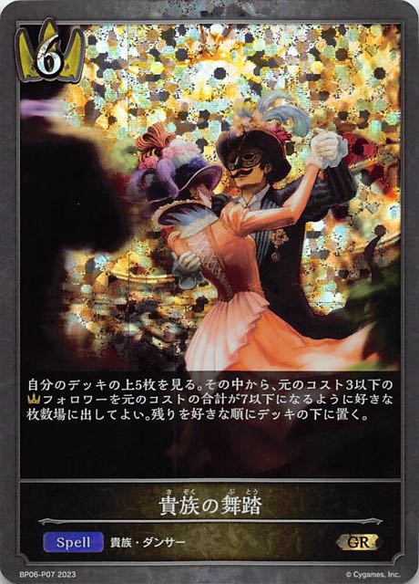 貴族の舞踏 クラス ロイヤル カード種類 スペル タイプ 貴族・ダンサー レアリティ GR・プレミアム 収録商品 ブースターパック第6弾「絶対なる覇者」 コスト6攻撃力-体力- 自分のデッキの上5枚を見る。その中から、元のコスト3以下のフォロワーを元のコストの合計が7以下になるように好きな枚数場に出してよい。残りを好きな順にデッキの下に置く。 鳩屋ハトBP06-P07
