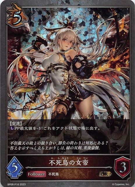 不死鳥の女帝 クラス ドラゴン カード種類 フォロワー タイプ 不死鳥 レアリティ GR・プレミアム 収録商品 ブースターパック第6弾「絶対なる覇者」 コスト5攻撃力5体力3 【突進】PP最大値を-1:これをアクト状態で場に出す。 不倶戴天の敵との競り合い、勝負の終わりは何処にある?答えを示すべく立ち上がりしは、緑の双剣、英俊豪傑。 liikoBP06-P16