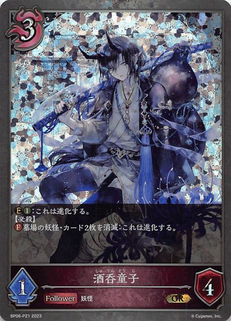 酒呑童子 クラス ナイトメア カード種類 フォロワー タイプ 妖怪 レアリティ GR・プレミアム 収録商品 ブースターパック第6弾「絶対なる覇者」 コスト3攻撃力1体力4 :これは進化する。【必殺】墓場の妖怪・カード2枚を消滅:これは進化する。 おにねこBP06-P21