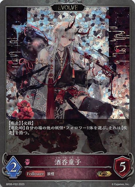 酒呑童子 クラス ナイトメア カード種類 フォロワー・エボルヴ タイプ 妖怪 レアリティ GR・プレミアム 収録商品 ブースターパック第6弾「絶対なる覇者」 コスト-攻撃力2体力5 【疾走】【必殺】【進化時】自分の場の他の妖怪・フォロワー1体を選ぶ。それは【疾走】を持つ。 おにねこBP06-P22