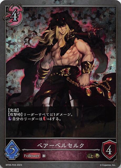 ベアーベルセルク クラス ナイトメア カード種類 フォロワー タイプ 獣 レアリティ GR・プレミアム 収録商品 ブースターパック第6弾「絶対なる覇者」 コスト4攻撃力5体力4 【突進】【攻撃時】リーダーすべてに1ダメージ。自分のリーダーは+4する。 萩オスBP06-P23