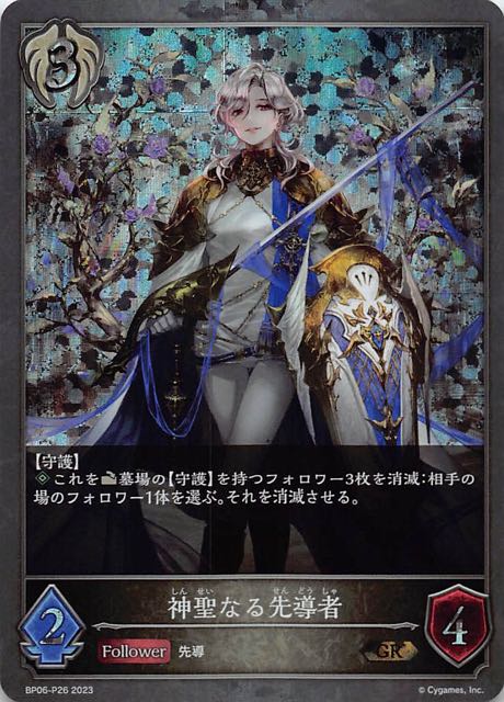 神聖なる先導者 クラス ビショップ カード種類 フォロワー タイプ 先導 レアリティ GR・プレミアム 収録商品 ブースターパック第6弾「絶対なる覇者」 コスト3攻撃力2体力4 【守護】これを墓場の【守護】を持つフォロワー3枚を消滅:相手の場のフォロワー1体を選ぶ。それを消滅させる。 BP06-P26