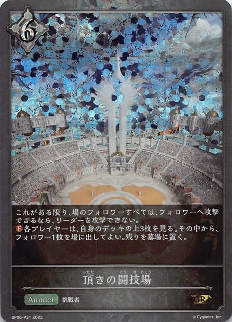 頂きの闘技場 クラス ニュートラル カード種類 アミュレット タイプ 挑戦者 レアリティ GR・プレミアム 収録商品 ブースターパック第6弾「絶対なる覇者」 コスト6攻撃力-体力- これがある限り、場のフォロワーすべては、フォロワーへ攻撃できるなら、リーダーを攻撃できない。各プレイヤーは、自身のデッキの上3枚を見る。その中から、フォロワー1枚を場に出してよい。残りを墓場に置く。 Josh HutchinsonBP06-P31
