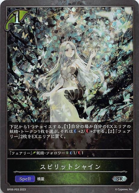 スピリットシャイン クラス エルフ カード種類 スペル タイプ 精霊 レアリティ SR・プレミアム 収録商品 ブースターパック第6弾「絶対なる覇者」 コスト1攻撃力-体力- 下記から1つチョイスする。【1】自分の場か自分のEXエリアの妖精・トークン1枚を選ぶ。それは+2/+2する。【2】『フェアリー』2枚をEXエリアに置く。―――――――――――――――『フェアリー』妖精・フォロワー1/1 おにねこBP06-P03