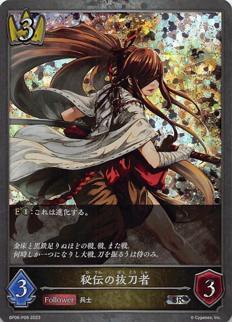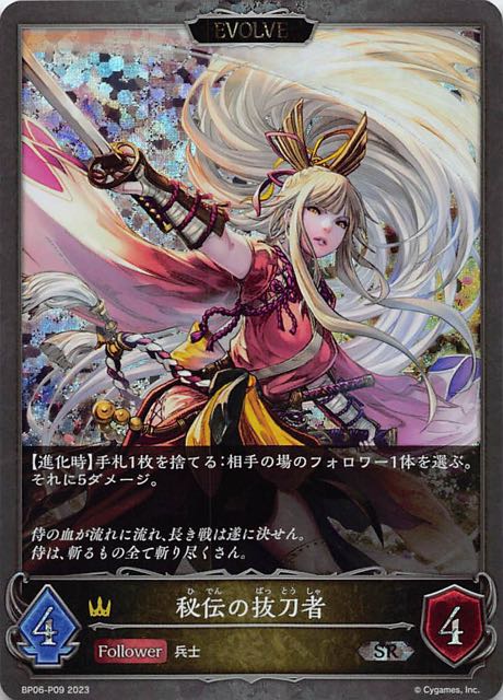 秘伝の抜刀者 クラス ロイヤル カード種類 フォロワー・エボルヴ タイプ 兵士 レアリティ SR・プレミアム 収録商品 ブースターパック第6弾「絶対なる覇者」 コスト-攻撃力4体力4 【進化時】手札1枚を捨てる:相手の場のフォロワー1体を選ぶ。それに5ダメージ。 侍の血が流れに流れ、長き戦は遂に決せん。侍は、斬るもの全て斬り尽くさん。 ShukeiBP06-P09