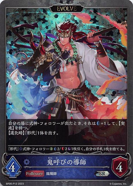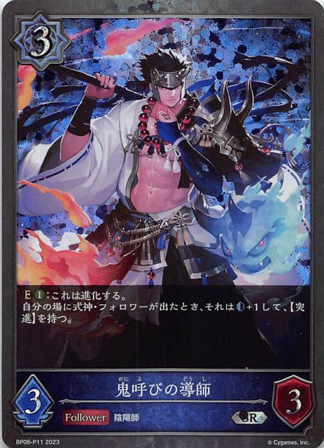 鬼呼びの導師 クラス ウィッチ カード種類 フォロワー タイプ 陰陽師 レアリティ SR・プレミアム 収録商品 ブースターパック第6弾「絶対なる覇者」 コスト3攻撃力3体力3 :これは進化する。自分の場に式神・フォロワーが出たとき、それは+1して、【突進】を持つ。 永守浩太BP06-P11