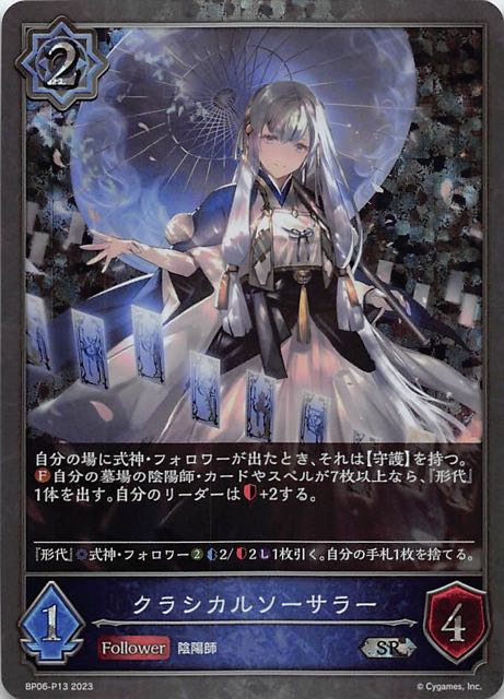 クラシカルソーサラー クラス ウィッチ カード種類 フォロワー タイプ 陰陽師 レアリティ SR・プレミアム 収録商品 ブースターパック第6弾「絶対なる覇者」 コスト2攻撃力1体力4 自分の場に式神・フォロワーが出たとき、それは【守護】を持つ。自分の墓場の陰陽師・カードやスペルが7枚以上なら、『形代』1体を出す。自分のリーダーは+2する。―――――――――――――――『形代』式神・フォロワー2/21枚引く。自分の手札1枚を捨てる。 ShuLaBP06-P13