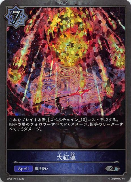 大紅蓮 クラス ウィッチ カード種類 スペル タイプ 魔法使い レアリティ SR・プレミアム 収録商品 ブースターパック第6弾「絶対なる覇者」 コスト7攻撃力-体力- これをプレイする際、【スペルチェイン_10】コストを-2する。相手の場のフォロワーすべてに6ダメージ。相手のリーダーすべてに3ダメージ。 永守浩太BP06-P14