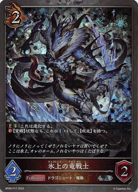 氷上の竜戦士 クラス ドラゴン カード種類 フォロワー タイプ ドラゴニュート・竜族 レアリティ SR・プレミアム 収録商品 ブースターパック第6弾「絶対なる覇者」 コスト2攻撃力2体力2 :これは進化する。【覚醒】状態なら、これは+1して、【疾走】を持つ。 ノリにノリにノってくぜ?ノれないヤツは置いてくぜ?ここは氷上、オレのホーム。ノれないやつはくたばりな。 タツヤキBP06-P17