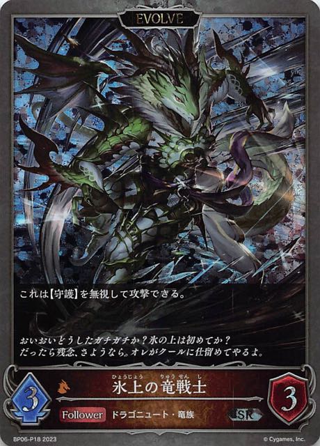 氷上の竜戦士 クラス ドラゴン カード種類 フォロワー・エボルヴ タイプ ドラゴニュート・竜族 レアリティ SR・プレミアム 収録商品 ブースターパック第6弾「絶対なる覇者」 コスト-攻撃力3体力3 これは【守護】を無視して攻撃できる。 おいおいどうしたガチガチか?氷の上は初めてか?だったら残念、さようなら。オレがクールに仕留めてやるよ。 タツヤキBP06-P18