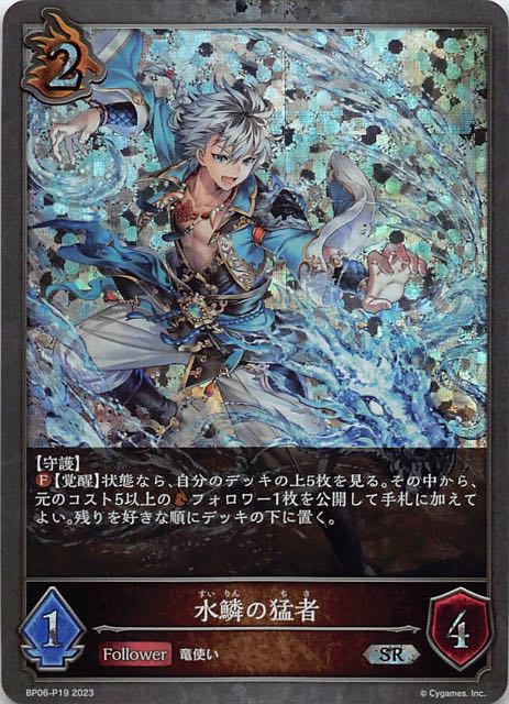 水鱗の猛者 クラス ドラゴン カード種類 フォロワー タイプ 竜使い レアリティ SR・プレミアム 収録商品 ブースターパック第6弾「絶対なる覇者」 コスト2攻撃力1体力4 【守護】【覚醒】状態なら、自分のデッキの上5枚を見る。その中から、元のコスト5以上のフォロワー1枚を公開して手札に加えてよい。残りを好きな順にデッキの下に置く。 根岸千秋BP06-P19