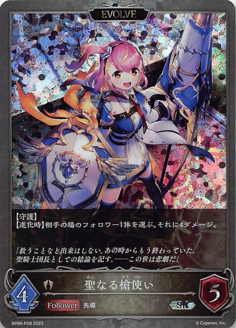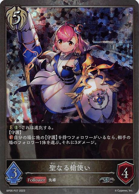 聖なる槍使い クラス ビショップ カード種類 フォロワー タイプ 先導 レアリティ SR・プレミアム 収録商品 ブースターパック第6弾「絶対なる覇者」 コスト5攻撃力3体力4 :これは進化する。【守護】自分の場に他の【守護】を持つフォロワーがいるなら、相手の場のフォロワー1体を選ぶ。それに3ダメージ。 えなれいんBP06-P27