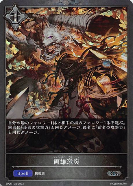 両雄激突 クラス ニュートラル カード種類 スペル タイプ 挑戦者 レアリティ SR・プレミアム 収録商品 ブースターパック第6弾「絶対なる覇者」 コスト1攻撃力-体力- 自分の場のフォロワー1体と相手の場のフォロワー1体を選ぶ。前者に「後者の攻撃力」と同じダメージ。後者に「前者の攻撃力」と同じダメージ。 ezusukeBP06-P32