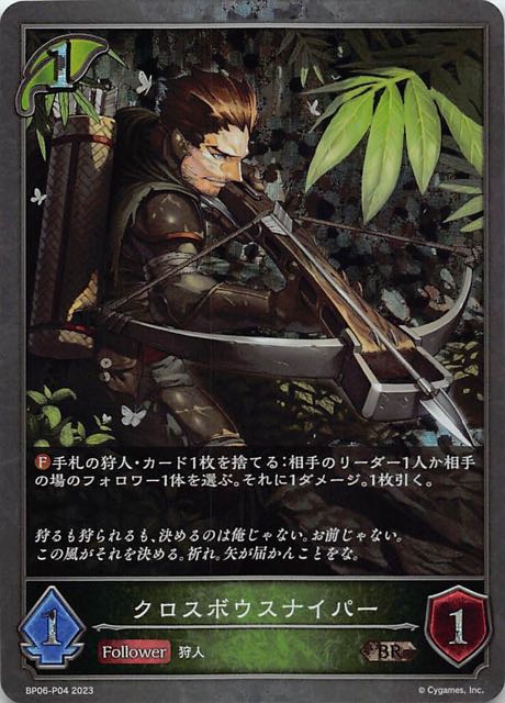 クロスボウスナイパー クラス エルフ カード種類 フォロワー タイプ 狩人 レアリティ BR・プレミアム 収録商品 ブースターパック第6弾「絶対なる覇者」 コスト1攻撃力1体力1 手札の狩人・カード1枚を捨てる:相手のリーダー1人か相手の場のフォロワー1体を選ぶ。それに1ダメージ。1枚引く。 狩るも狩られるも、決めるのは俺じゃない。お前じゃない。この風がそれを決める。祈れ。矢が届かんことをな。 イシバシヨウスケBP06-P04