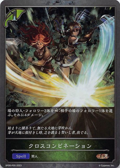 クロスコンビネーション クラス エルフ カード種類 スペル タイプ 狩人 レアリティ BR・プレミアム 収録商品 ブースターパック第6弾「絶対なる覇者」 コスト1攻撃力-体力- 場の狩人・フォロワー2体を:相手の場のフォロワー1体を選ぶ。それに4ダメージ。 始まりに種ありて、無たる大地に芽吹かん。芽が大地に根付きし時、之を護ると誓いし者、出でる。 BP06-P05