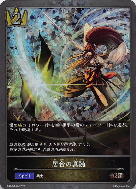 居合の真髄 クラス ロイヤル カード種類 スペル タイプ 兵士 レアリティ BR・プレミアム 収録商品 ブースターパック第6弾「絶対なる覇者」 コスト2攻撃力-体力- 場のフォロワー1体を:相手の場のフォロワー1体を選ぶ。それを破壊する。 時の将軍、病に臥せり。天下を目指す侍、ずらり。数多の刀が鞘走り、合戦の雨が降らん。 ShukeiBP06-P10