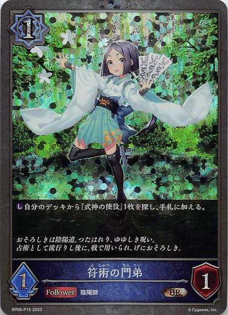 符術の門弟 クラス ウィッチ カード種類 フォロワー タイプ 陰陽師 レアリティ BR・プレミアム 収録商品 ブースターパック第6弾「絶対なる覇者」 コスト1攻撃力1体力1 自分のデッキから『式神の使役』1枚を探し、手札に加える。 おそろしきは陰陽道。つたはれり、ゆゆしき呪い。占術として流行りし後に、戦で用いられ、げにおそろしき。 巻BP06-P15