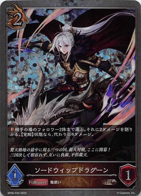 ソードウィップドラグーン クラス ドラゴン カード種類 フォロワー タイプ 竜使い レアリティ BR・プレミアム 収録商品 ブースターパック第6弾「絶対なる覇者」 コスト2攻撃力1体力1 相手の場のフォロワー2体まで選ぶ。それに2ダメージを割りふる。【覚醒】状態なら、代わりに4ダメージ。 驚天動地の最中に現る三つの国。龍人対戦、ここに開幕!三国決して相容れず。互いに仇敵、不倶戴天。 BIYOBP06-P20