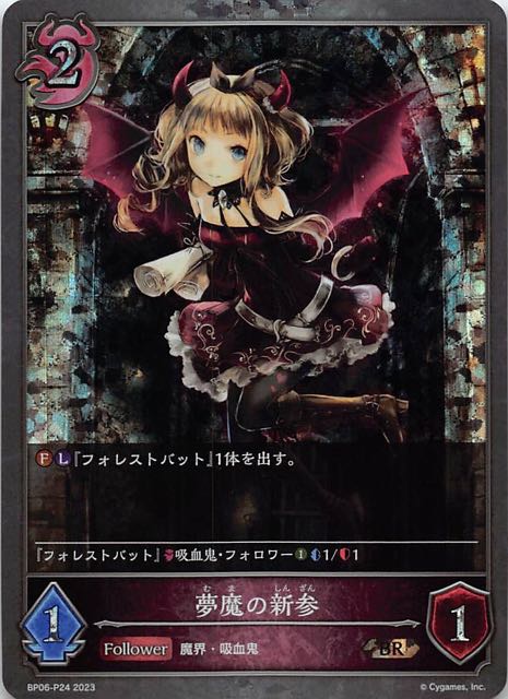 夢魔の新参 クラス ナイトメア カード種類 フォロワー タイプ 魔界・吸血鬼 レアリティ BR・プレミアム 収録商品 ブースターパック第6弾「絶対なる覇者」 コスト2攻撃力1体力1 『フォレストバット』1体を出す。―――――――――――――――『フォレストバット』吸血鬼・フォロワー1/1 おにねこBP06-P24