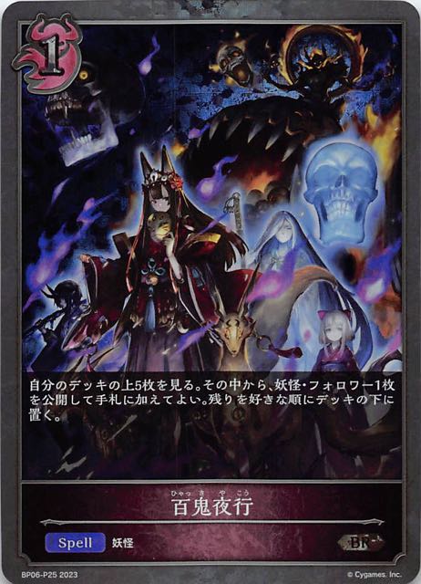 百鬼夜行 クラス ナイトメア カード種類 スペル タイプ 妖怪 レアリティ BR・プレミアム 収録商品 ブースターパック第6弾「絶対なる覇者」 コスト1攻撃力-体力- 自分のデッキの上5枚を見る。その中から、妖怪・フォロワー1枚を公開して手札に加えてよい。残りを好きな順にデッキの下に置く。 AkefumiBP06-P25