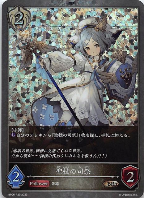 聖杖の司祭 クラス ビショップ カード種類 フォロワー タイプ 先導 レアリティ BR・プレミアム 収録商品 ブースターパック第6弾「絶対なる覇者」 コスト2攻撃力2体力2 【守護】自分のデッキから『聖杖の司祭』1枚を探し、手札に加える。 「悲劇の世界。神様に見捨てられた世界。だから僕が……神様の代わりにみんなを救うんだ!」 みけぼしBP06-P29