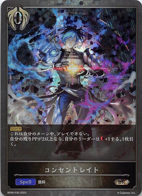 コンセントレイト クラス ビショップ カード種類 スペル タイプ 信仰 レアリティ BR・プレミアム 収録商品 ブースターパック第6弾「絶対なる覇者」 コスト0攻撃力-体力- これは自分のターン中、プレイできない。自分の残りPPが2以上なら、自分のリーダーは+1する。1枚引く。 オーベン道玄坂BP06-P30