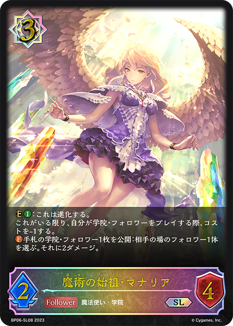 魔術の始祖・マナリア クラス ウィッチ カード種類 フォロワー タイプ 魔法使い・学院 レアリティ SL 収録商品 ブースターパック第6弾「絶対なる覇者」 コスト3攻撃力2体力4 :これは進化する。これがいる限り、自分が学院・フォロワーをプレイする際、コストを-1する。手札の学院・フォロワー1枚を公開:相手の場のフォロワー1体を選ぶ。それに2ダメージ。 久方綜司BP06-SL08