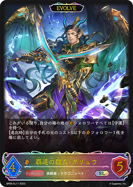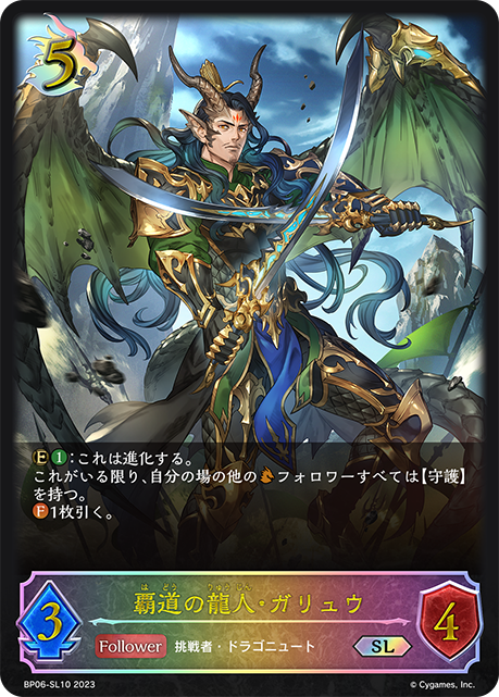 覇道の龍人・ガリュウ クラス ドラゴン カード種類 フォロワー タイプ 挑戦者・ドラゴニュート レアリティ SL 収録商品 ブースターパック第6弾「絶対なる覇者」 コスト5攻撃力3体力4 :これは進化する。これがいる限り、自分の場の他のフォロワーすべては【守護】を持つ。1枚引く。 薄雲ねずBP06-SL10
