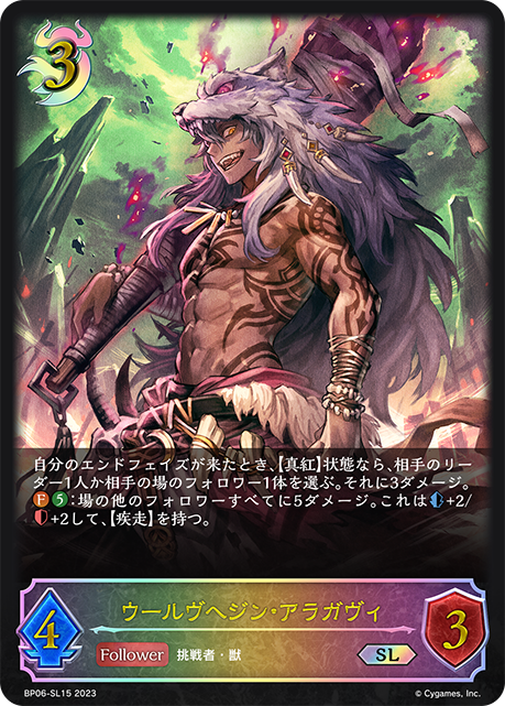 ウールヴヘジン・アラガヴィ クラス ナイトメア カード種類 フォロワー タイプ 挑戦者・獣 レアリティ SL 収録商品 ブースターパック第6弾「絶対なる覇者」 コスト3攻撃力4体力3 自分のエンドフェイズが来たとき、【真紅】状態なら、相手のリーダー1人か相手の場のフォロワー1体を選ぶ。それに3ダメージ。:場の他のフォロワーすべてに5ダメージ。これは+2/+2して、【疾走】を持つ。 まよこBP06-SL15