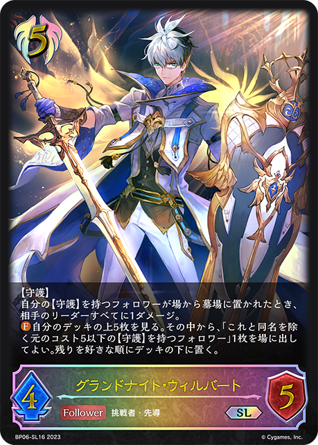 グランドナイト・ウィルバート クラス ビショップ カード種類 フォロワー タイプ 挑戦者・先導 レアリティ SL 収録商品 ブースターパック第6弾「絶対なる覇者」 コスト5攻撃力4体力5 【守護】自分の【守護】を持つフォロワーが場から墓場に置かれたとき、相手のリーダーすべてに1ダメージ。自分のデッキの上5枚を見る。その中から、「これと同名を除く元のコスト5以下の【守護】を持つフォロワー」1枚を場に出してよい。残りを好きな順にデッキの下に置く。 みけぼしBP06-SL16